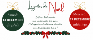 La magie de Noël arrive pour nos Babys et Eveils ! Rejoignez nous pour un moment tout doux et plein de surprises ! Samedi 13 décembre de 9h30 à 11h et Mercredi 17 décembre de 10h-11h30 Au programme : Visite du Père Noël , chocolats, activité de Noël et beaucoup de bonne humeur ! On compte …